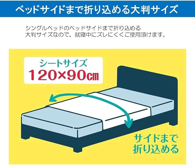 ベッドサイドまで折り込める120×90cmの大判サイズで、万一の漏れを防ぐ