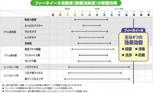 純度の高い水酸化カルシウムを使用した「フィーネイーネ 尿臭・便臭・オムツの消臭剤」は、そのアルカリ性成分に強力な除菌効果があり、多くの菌やウイルスが不活化します。